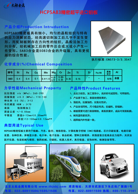 HCP5A83精密鋁板對(duì)雜質(zhì)、堿金屬元素和低熔點(diǎn)元素的嚴(yán)格控制提高了合金的耐蝕性和抗蠕變能力,板材兩面經(jīng)過銑磨加工呈現(xiàn)出超平精細(xì)表面,尺寸公差標(biāo)準(zhǔn)全球領(lǐng)先,出廠全檢,可雙面貼膜保護(hù),強(qiáng)度超過歐洲同類產(chǎn)品,厚度規(guī)格覆蓋率高(≥4.5mm)。